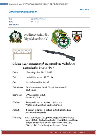 14 Chronik & Erfolge HTTP://WWW.SCHUETZENVEREIN-DIPPOLDISWALDE.DE/ 28.12.2019 1B0BJahresabschlußschießen Ort: Schießstand Paulsdorf Zeit: 14 – 17 Uhr Schießleiter: sv_1481 _dipps@gmx .de Seite 14