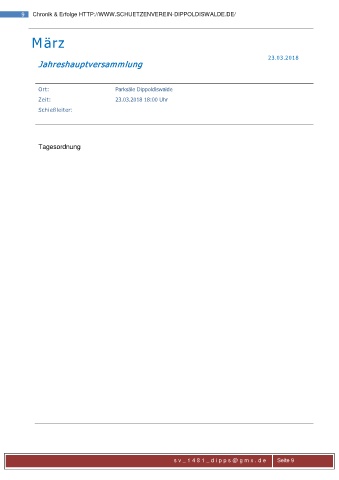 9 Chronik & Erfolge HTTP://WWW.SCHUETZENVEREIN-DIPPOLDISWALDE.DE/ März 23.03.2018 Jahreshauptversammlung Ort: Parksäle Dippoldiswalde Zeit: 23.03.2018 18:00 Uhr Schießleiter: Tagesordnung s v _1481_di pps @ gm x .de Seite 9