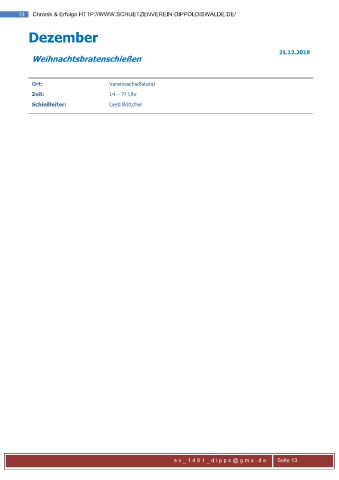 13 Chronik & Erfolge HTTP://WWW.SCHUETZENVEREIN-DIPPOLDISWALDE.DE/ Dezember 21.12.2019 1B0BWeihnachtsbratenschießen Ort: Vereinsschießstand Zeit: 14 – ?? Uhr Schießleiter: Gerd Böttcher sv_1481 _dipps@gmx .de Seite 13