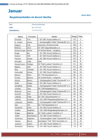 4 Chronik & Erfolge HTTP://WWW.SCHUETZENVEREIN-DIPPOLDISWALDE.DE/ Januar 05.01.2019 1B0BNeujahrsschießen im Kurort Hartha Ort: Raumschießanlage Zeit: ab 13:00 Uhr Schießleiter: ?????????????? sv_1481 _dipps@gmx .de Seite 4