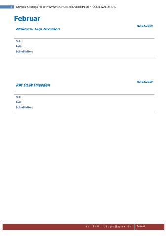 6 Chronik & Erfolge HTTP://WWW.SCHUETZENVEREIN-DIPPOLDISWALDE.DE/ Februar 02.02.2019 1B0BMakarov-Cup Dresden Ort: Zeit: Schießleiter: 03.02.2019 1B0BKM DLW Dresden Ort: Zeit: Schießleiter: sv_1481 _dipps@gmx .de Seite 6